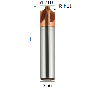 Concave radius end mills, four flutes, high quality micro-grain hard metal, for metals machining, hard blade coated / EXCELLENCY SERIES / indicated for round bevelling in pass. Excellent results in all working conditions. Thanks to our coating, tool protection is guaranteed even at high temperatures.